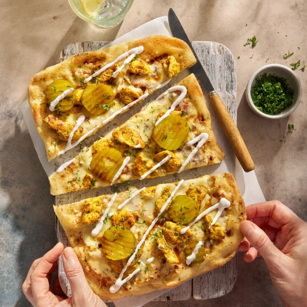 A cosy take on chicken shawarma: toasted flatbread, mozzarella, tahini-cream sauce, pickles and pomegranate. A feel-good Twin Chefs creation inspired by classic Middle Eastern flavours.