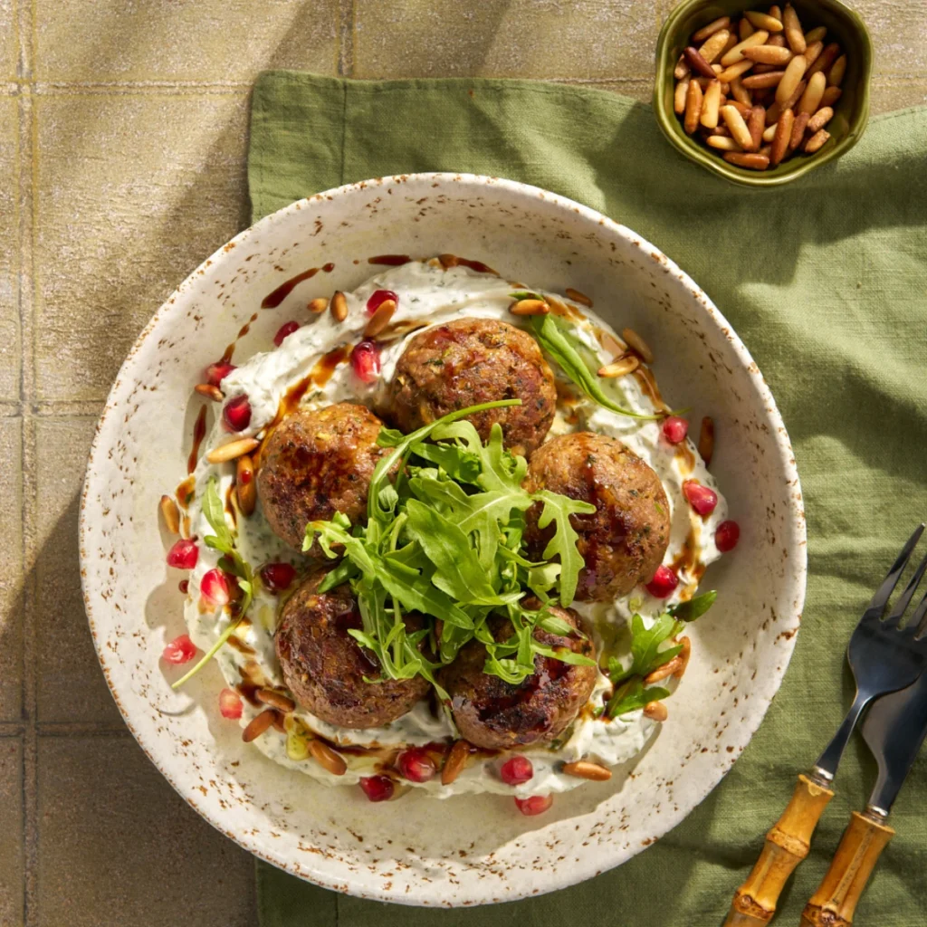 The Twin Chefs’ signature dish: tender lamb and date meatballs on creamy labneh, topped with rocket and pomegranate. A feel-good Emirati flavour moment, made for sharing.