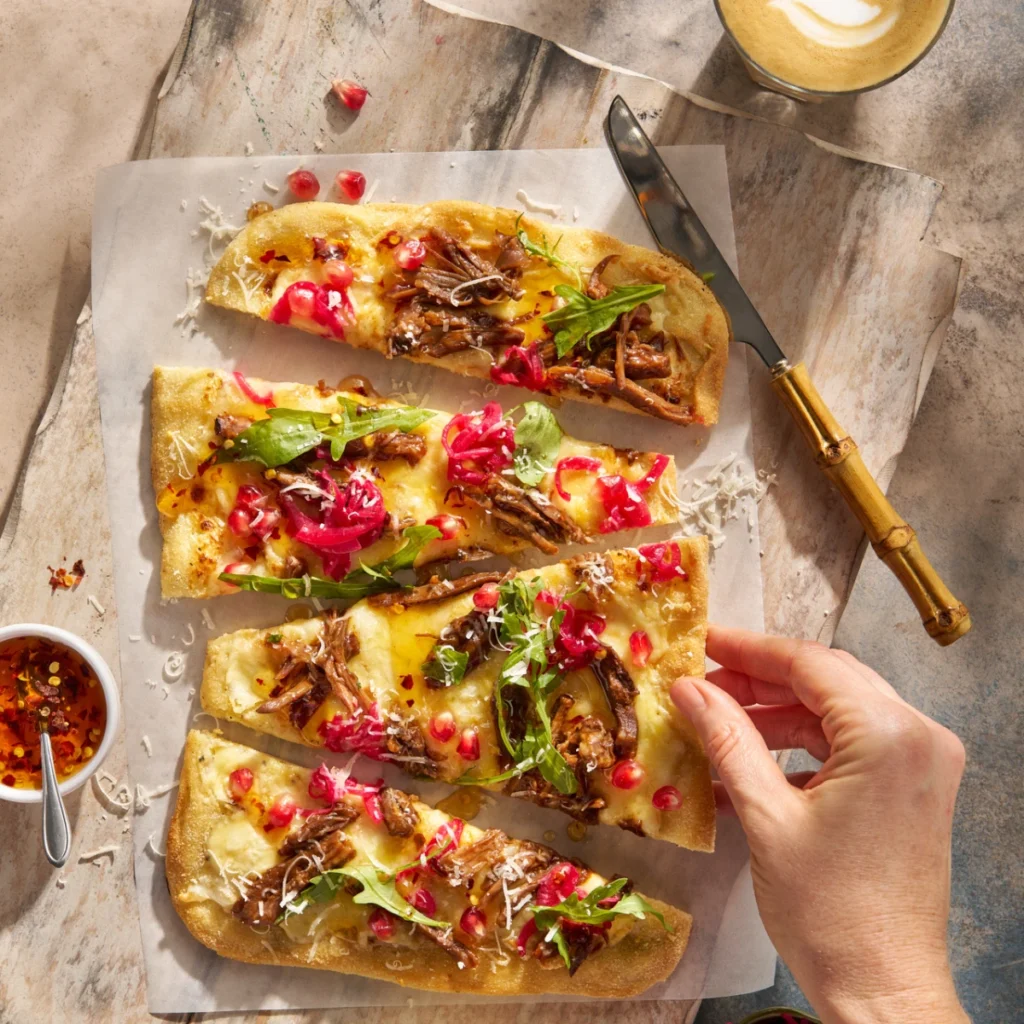 Pulled beef short rib on creamy mozzarella–parmesan flatbread, finished with fresh herbs, pomegranate and pear. A rich, slow-cooked Twin Chefs favourite with proper Emirati warmth.